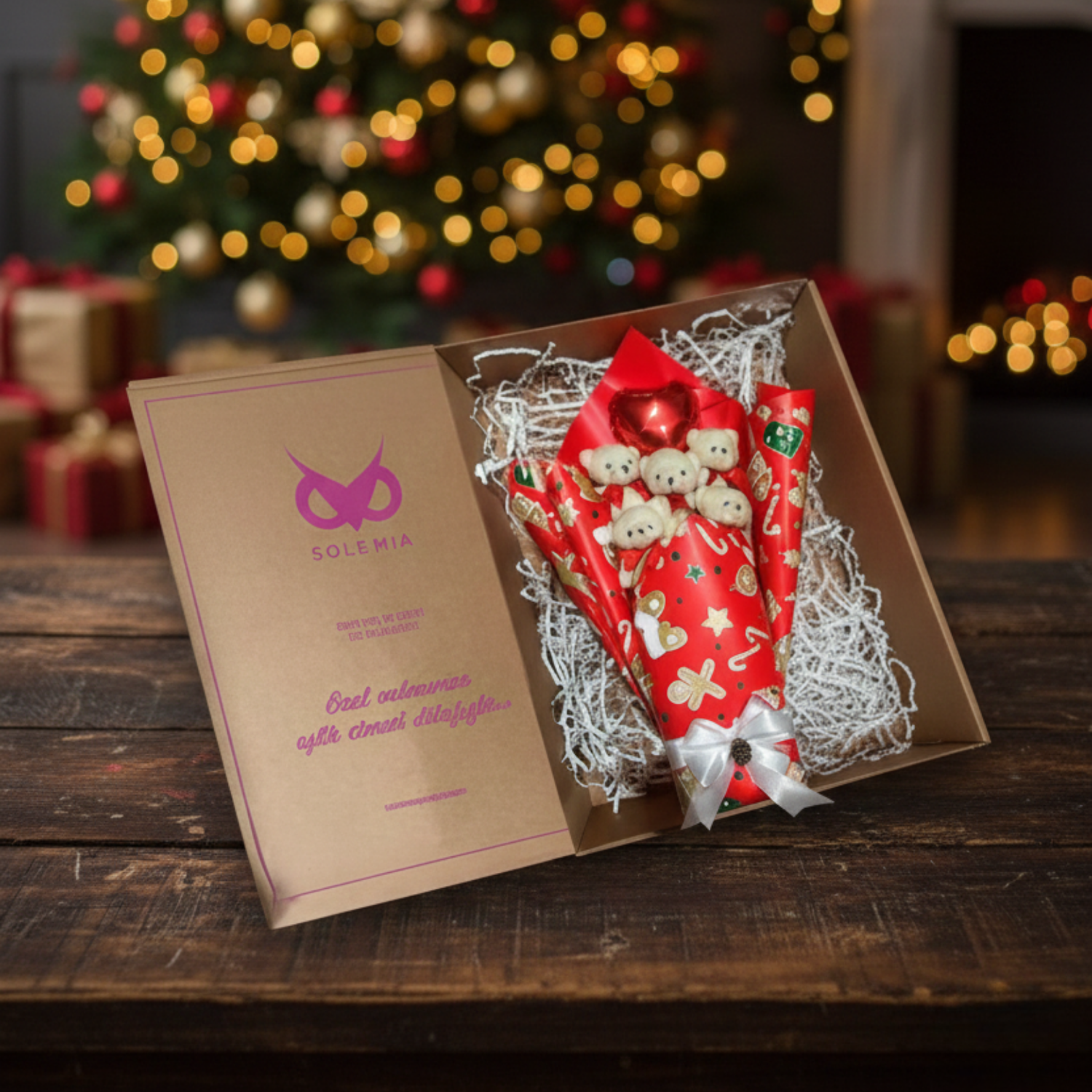 Premium Özel Yeniyıl - Yılbaşı Konsepti Romantik Kırmızı - Beyaz Peluş Ayıcık Buketi-Sevdiklerinize Özel...