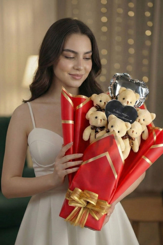 Kadınlar Günü'ne Özel: Mesajlı Kalp Aynalı ve Kalp Balonlu Kırmızı Peluş 6'lı Ayıcık Buketi | Sevgiliye Özel