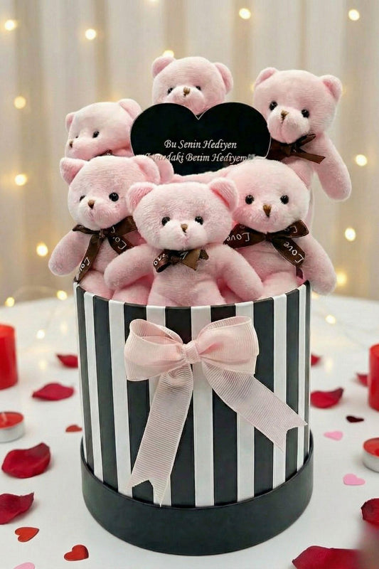 Kadınlar Gününe ÖZEL: Deluxe Krem Peluş Silindir Kutuda, LED Işıklı Kalpli Balonlu 6’lı Boz Ayıcık Buketi - Sevdiğine Hediye