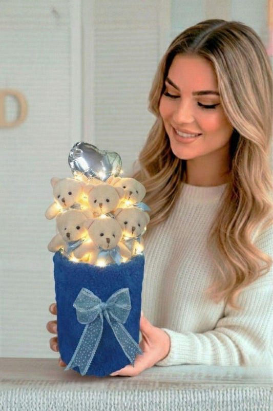 Kadınlar Gününe ÖZEL: Deluxe Lacivert Peluş Silindir Kutuda, LED Işıklı Kalpli Balonlu 6’lı Lacivert Ayıcık Buketi - Sevdiğine Hediye