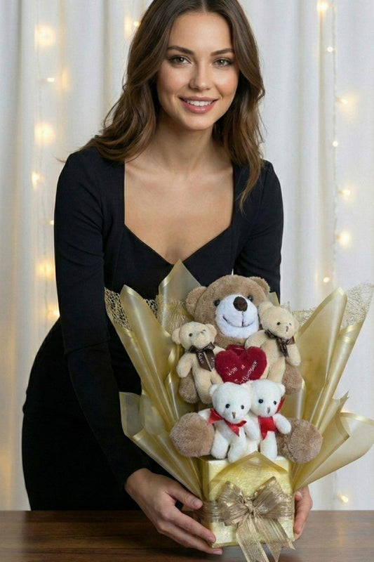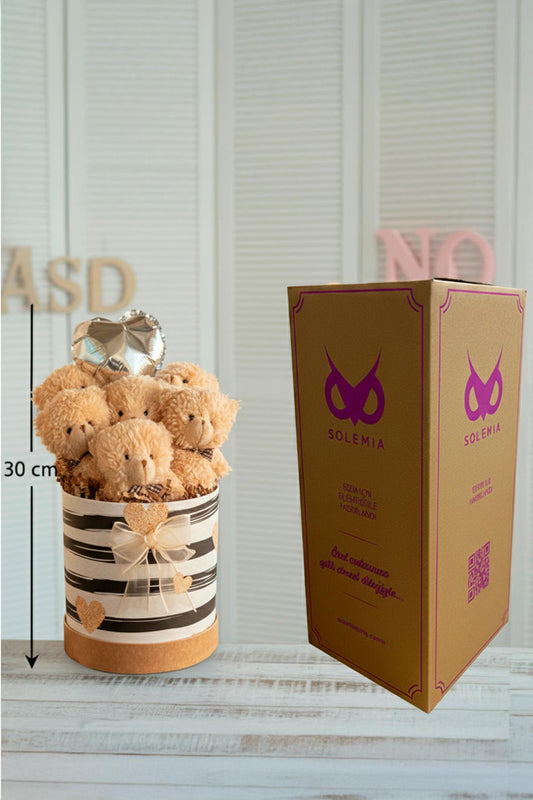 Kadınlar Gününe ÖZEL: Premium Silindir Hediye Kutusunda, Kalp Balonlu LED Işıklı 6’lı Taba Ayıcık Buketi, Sevdiğini Hediye