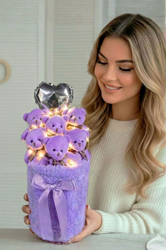 Kadınlar Gününe ÖZEL: Deluxe LED Işıklı Mor Peluş Silindir Kutuda, Kalpli Balonlu 6’lı Mor Ayıcık Buketi - Sevdiğine Hediye