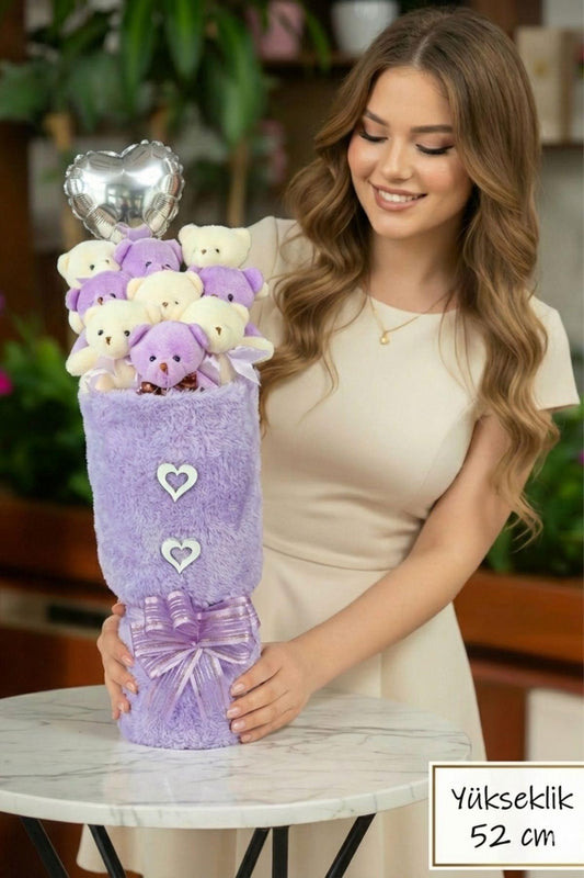 100 TEDDİ Peluş Ayı ve Premium Yumoş MOR Peluş Ayıcık Buketi