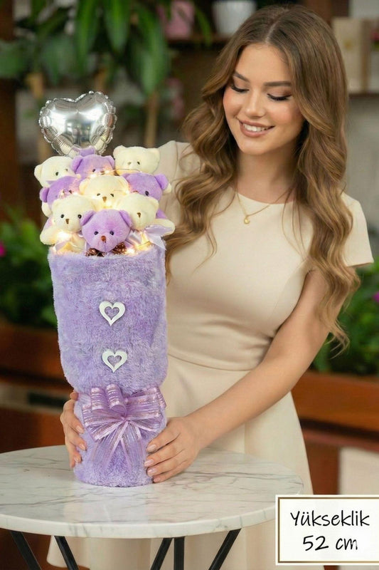 Kadınlar Gününe ÖZEL: Deluxe Mor-Beyaz Peluş Ayıcık LED Işıklı Kalp Balonlu Peluş Vazo Tasarımlı Ayıcık Buketi