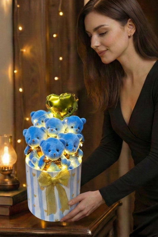 Kadınlar Gününe ÖZEL: LED Peri Işıklı Gold Detaylı Premium Silindir Kutuda, Kalpli Balonlu 6’lı Mavi Ayıcık Buketi