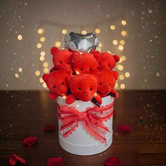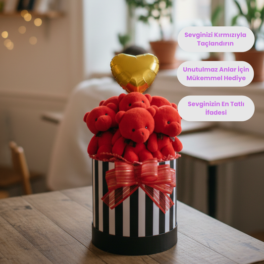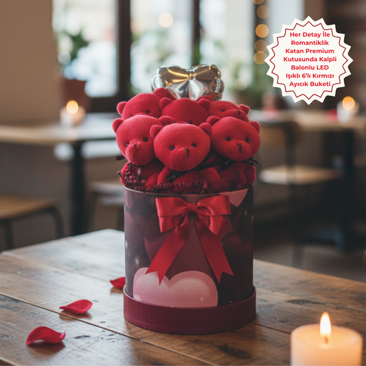 Premium Silindir Hediye Kutusunda, Kalpli Balonlu 6’lı Kırmızı Ayıcık Buketi