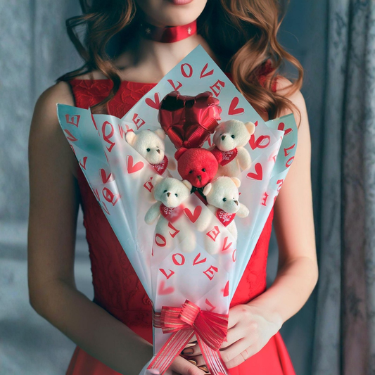 Premium Kalp Balonlu LOVE Temalı Kırmızı Beyaz Peluş Ayıcık Buketi