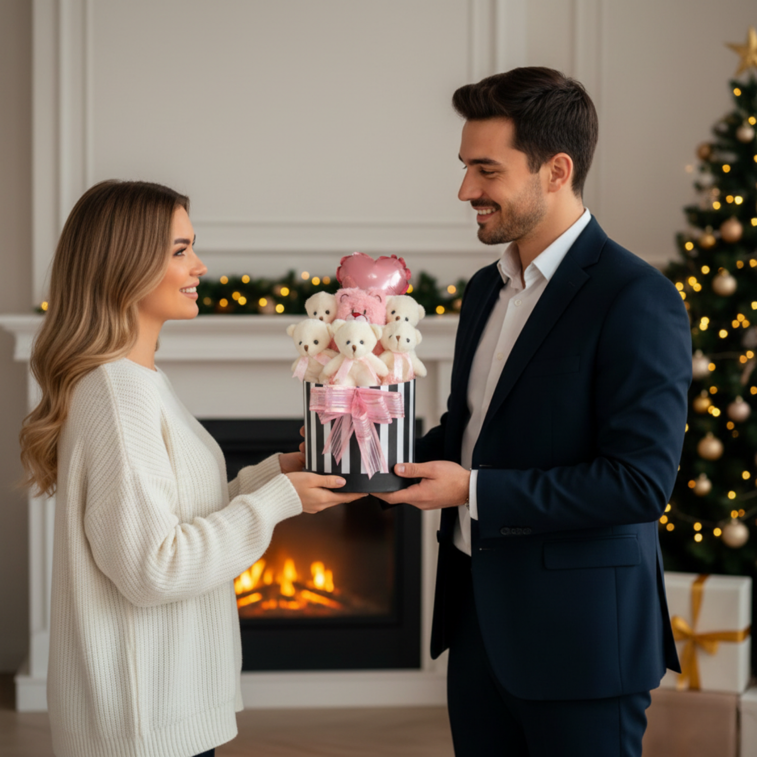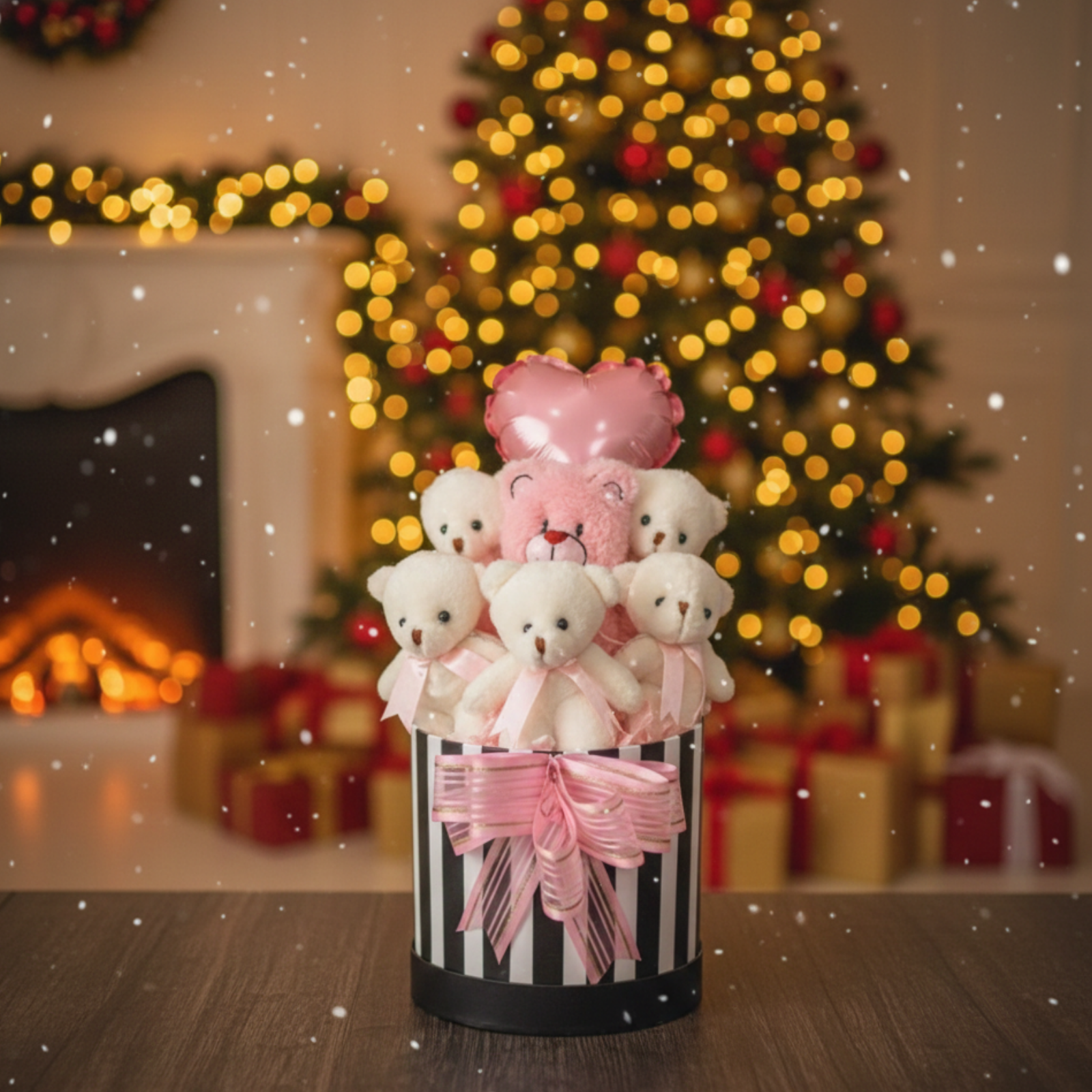 Sevdiklerinize yumuşacık bir mutluluk hediye edin! Premium silindir kutusunda sunulan, LED ışıkların büyüsü ve pembe ayıcıkların sevimli sıcaklığıyla, bu buket kalbinizi tek tıkla ifade eder.
