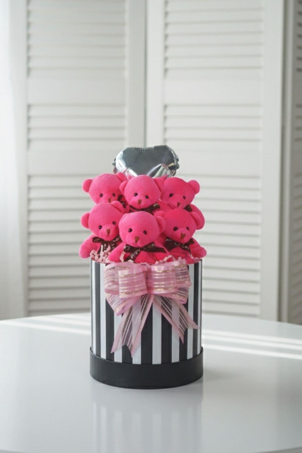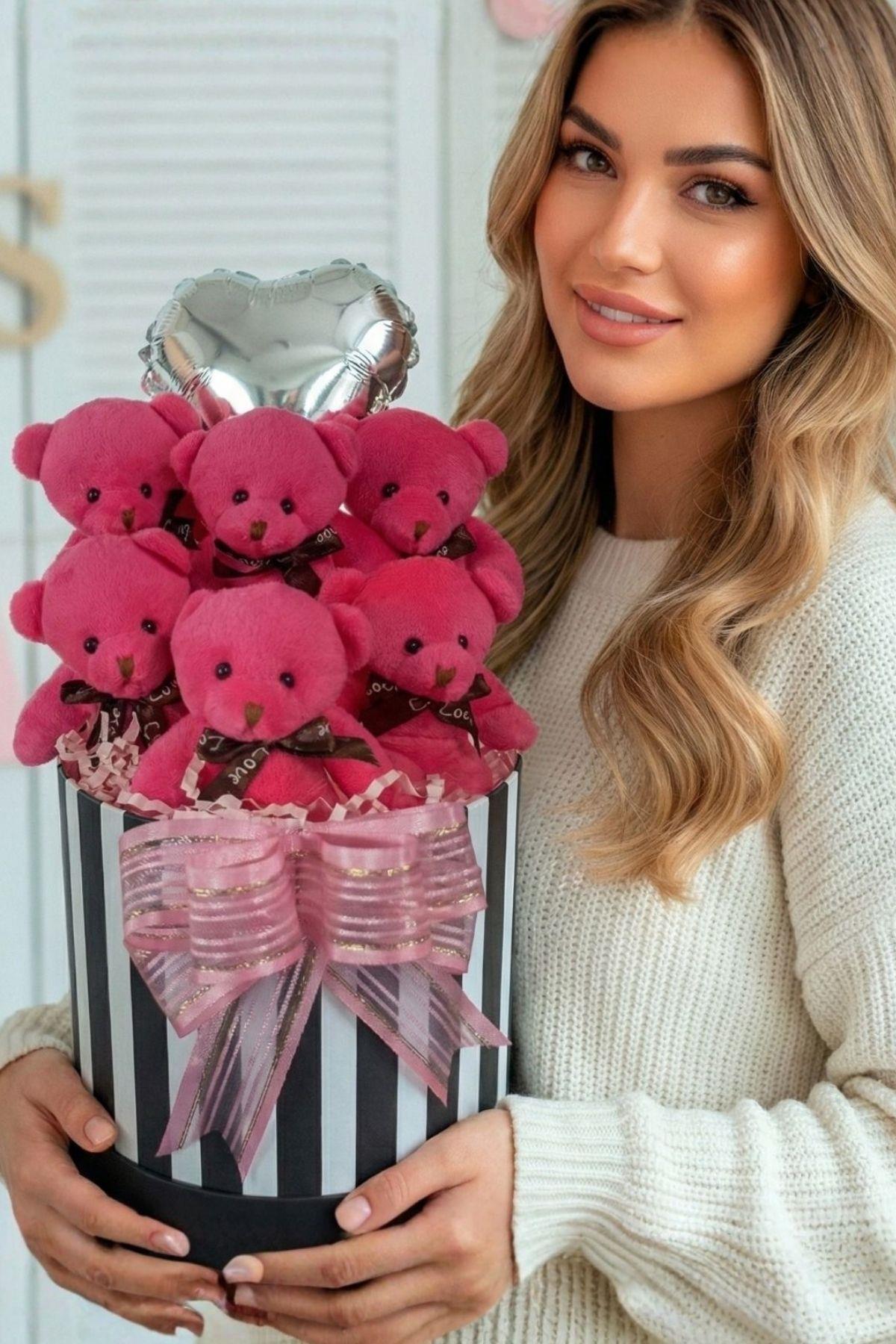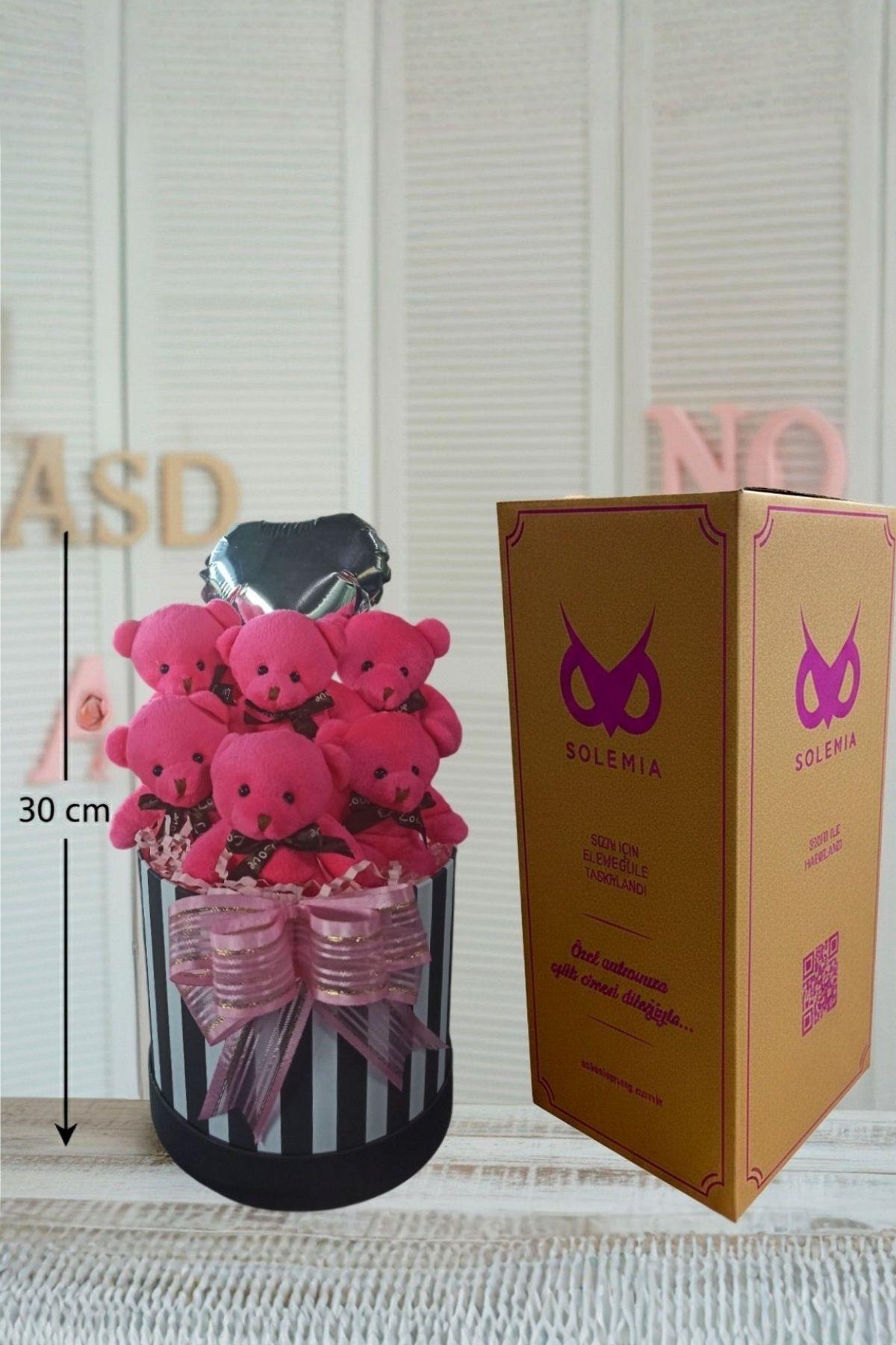 Kadınlar Gününe ÖZEL: Premium Silindir Hediye Kutusunda, Kalpli Balonlu 6’lı Fuşya Ayıcık Buketi
