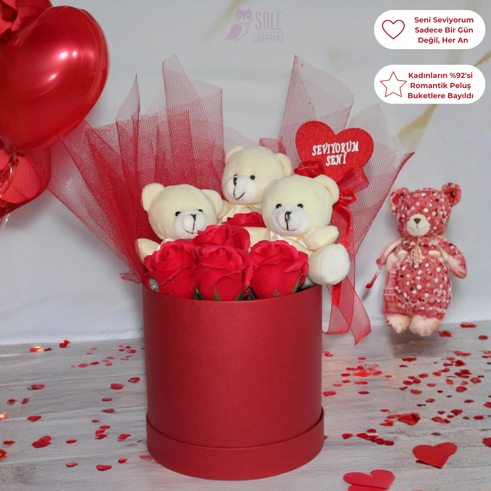 Kelimelerin yerini alan bir sürpriz... Sevgilinize yumuşacık bir mutluluk hediye edin! Şık kutusunda sunulan bu özel buket, "Seni Seviyorum" pankartı ve kokulu güllerle kalbinden geçen her şeyi bir bakışta anlatıyor.