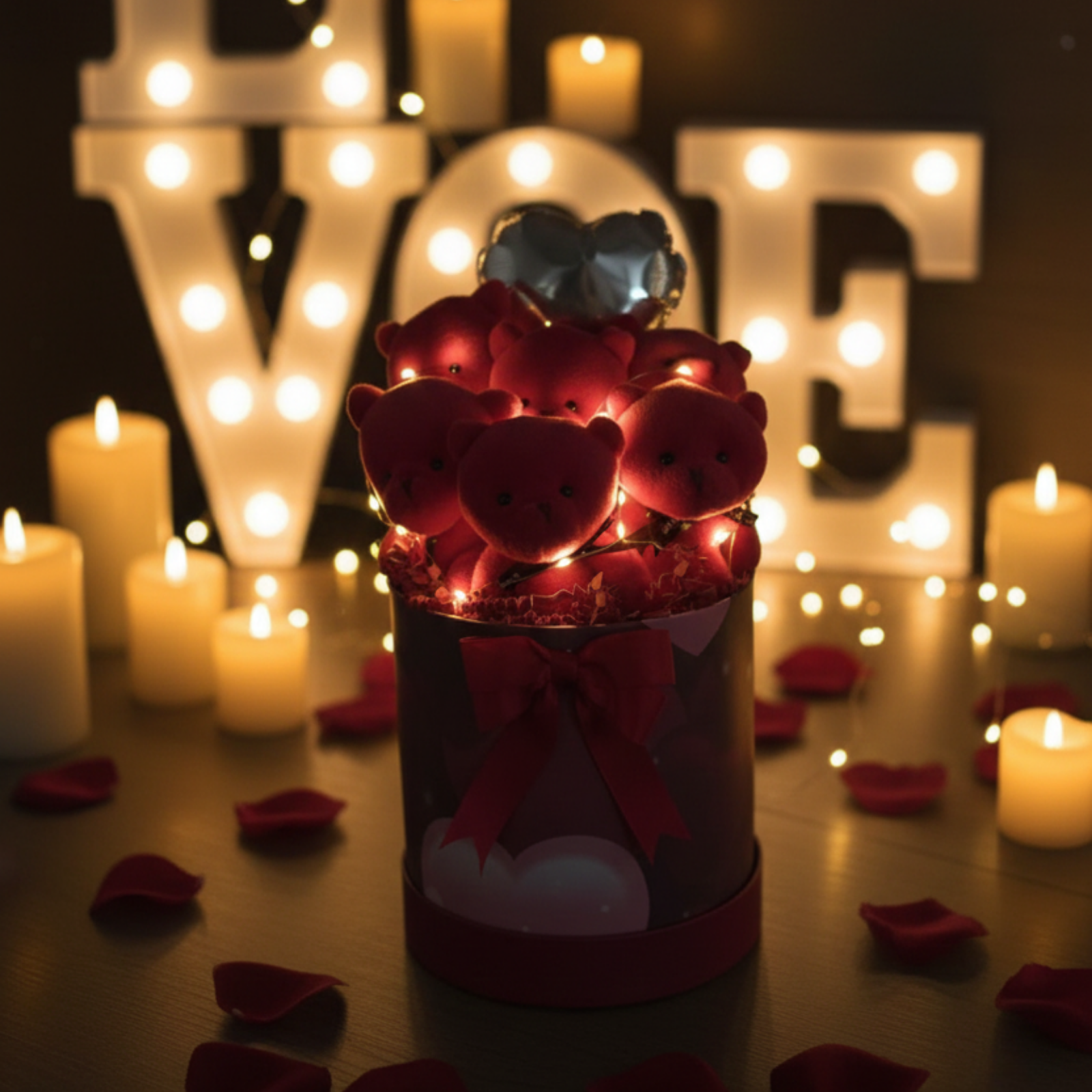 🌹 Kırmızı Tutkunun Işıltısı: LED Işıklı Premium Kalpli Kırmızı Ayıcık Buketi