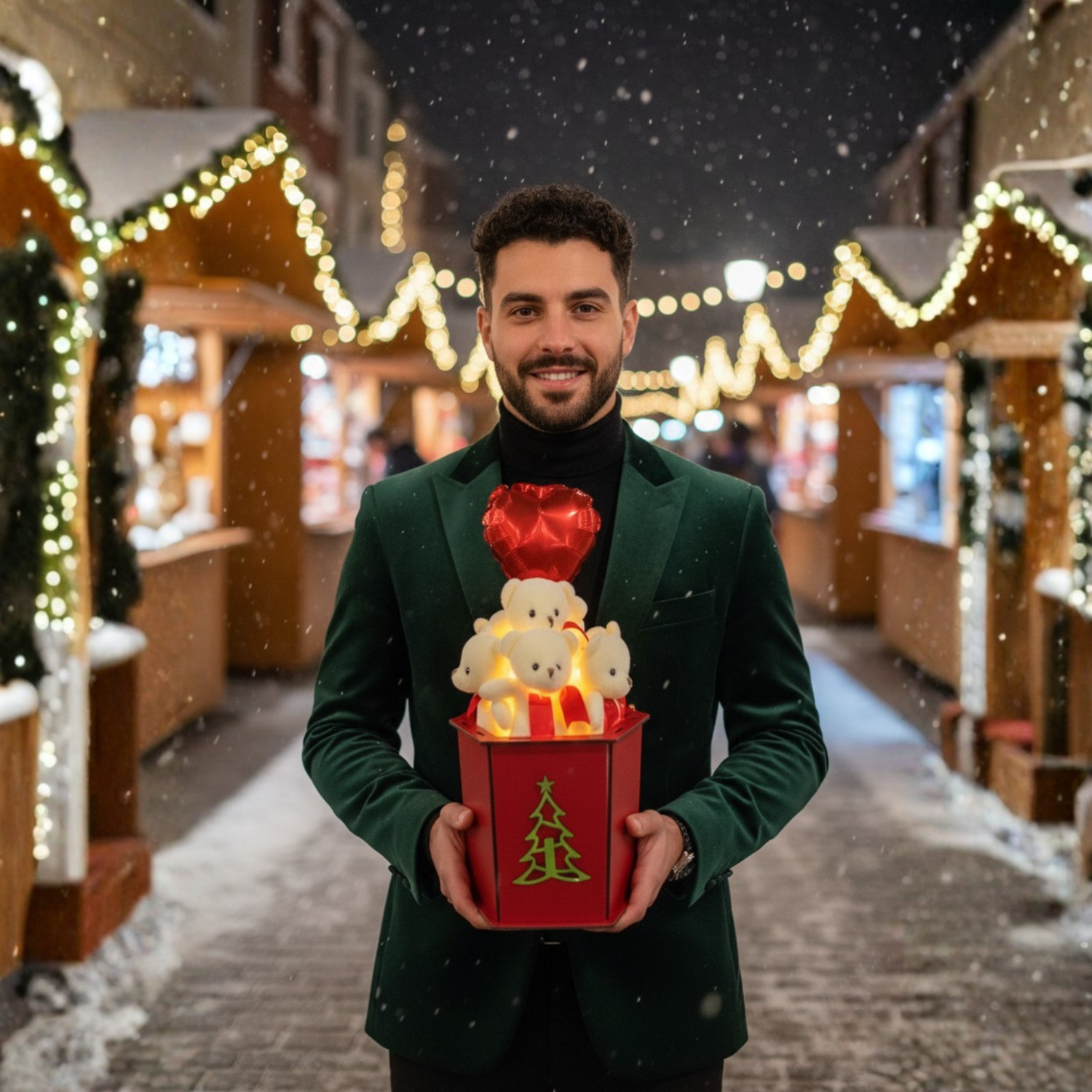 Kırmızı, LED Işıklı Ayıcık Buketimizle bu yılbaşında fark yaratın. Özel kadife ceketinizle bir Noel pazarının ortasındaki bu an gibi, hediyeniz de unutulmaz olmalı!