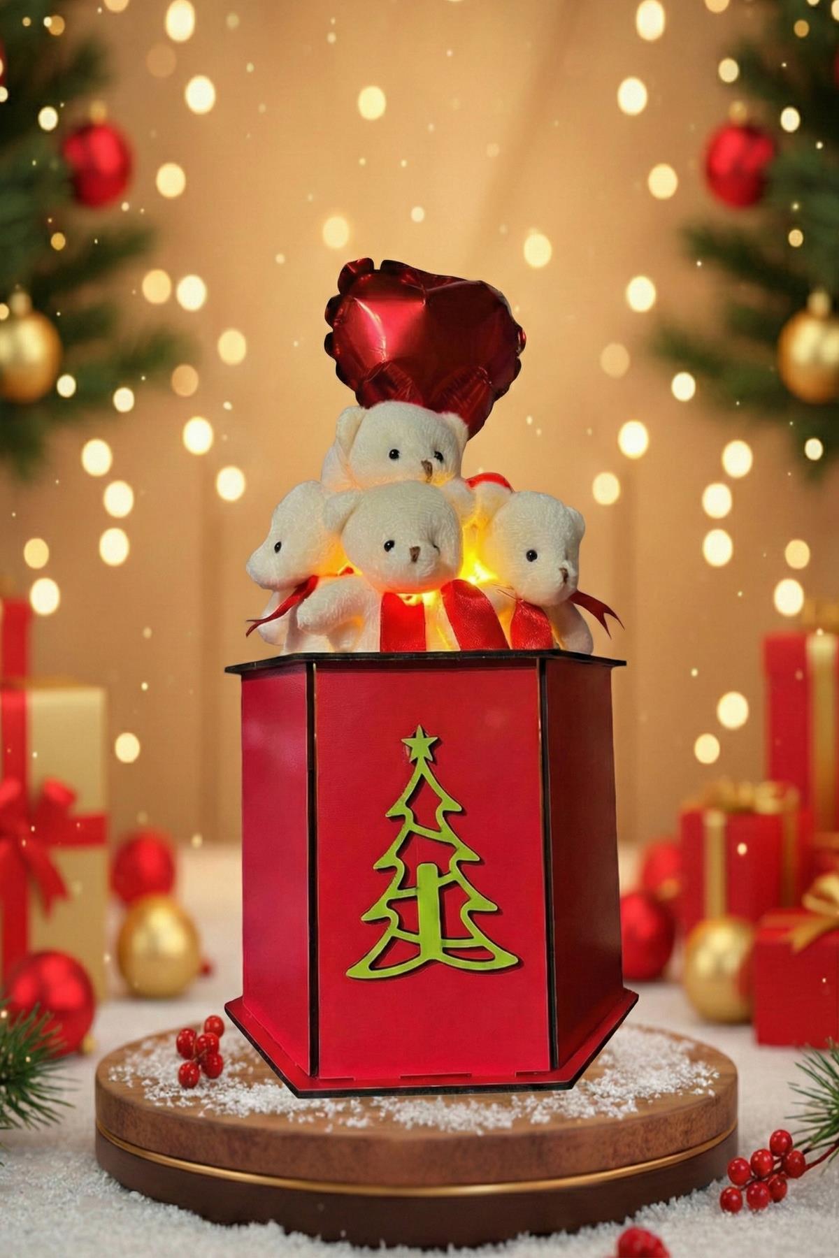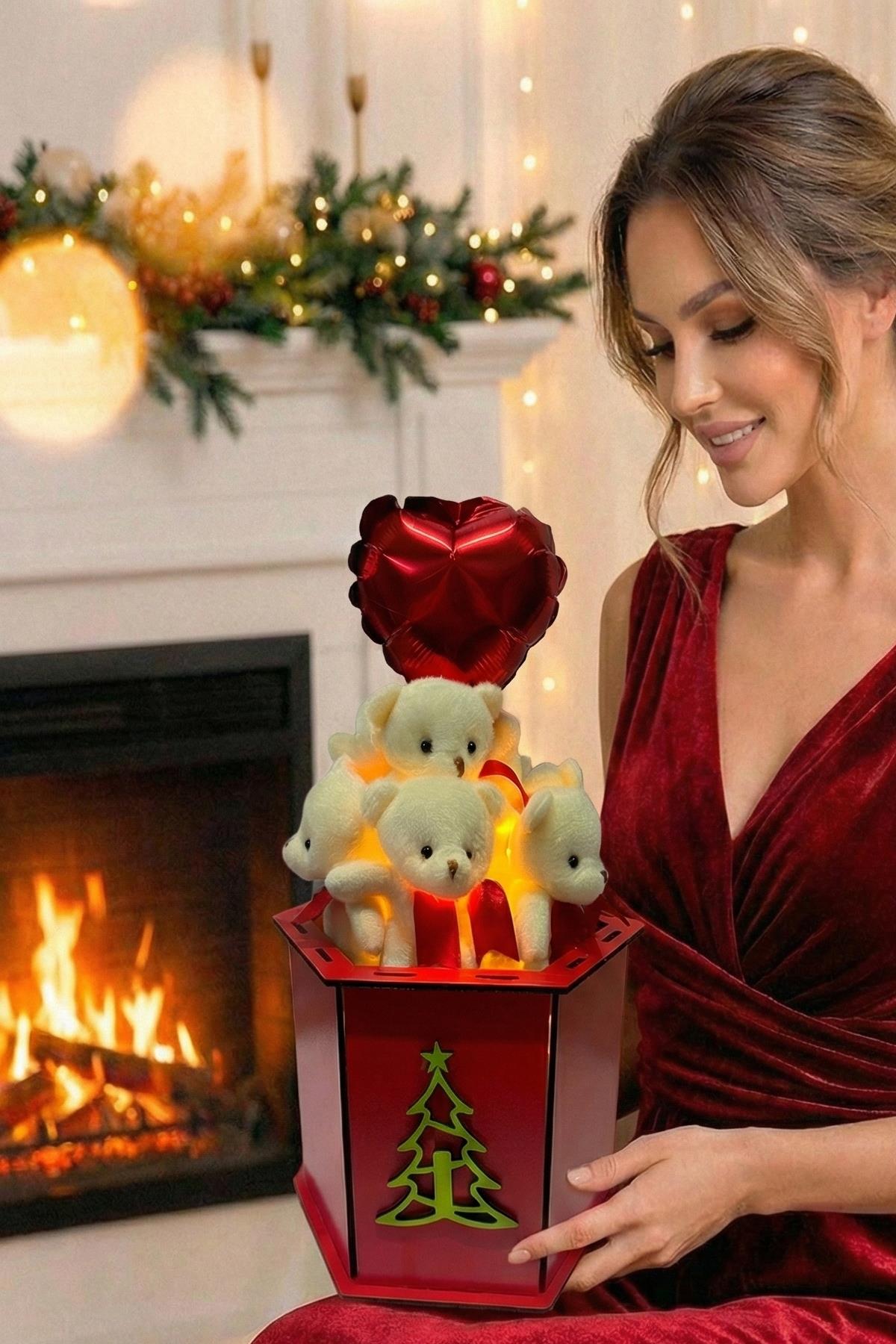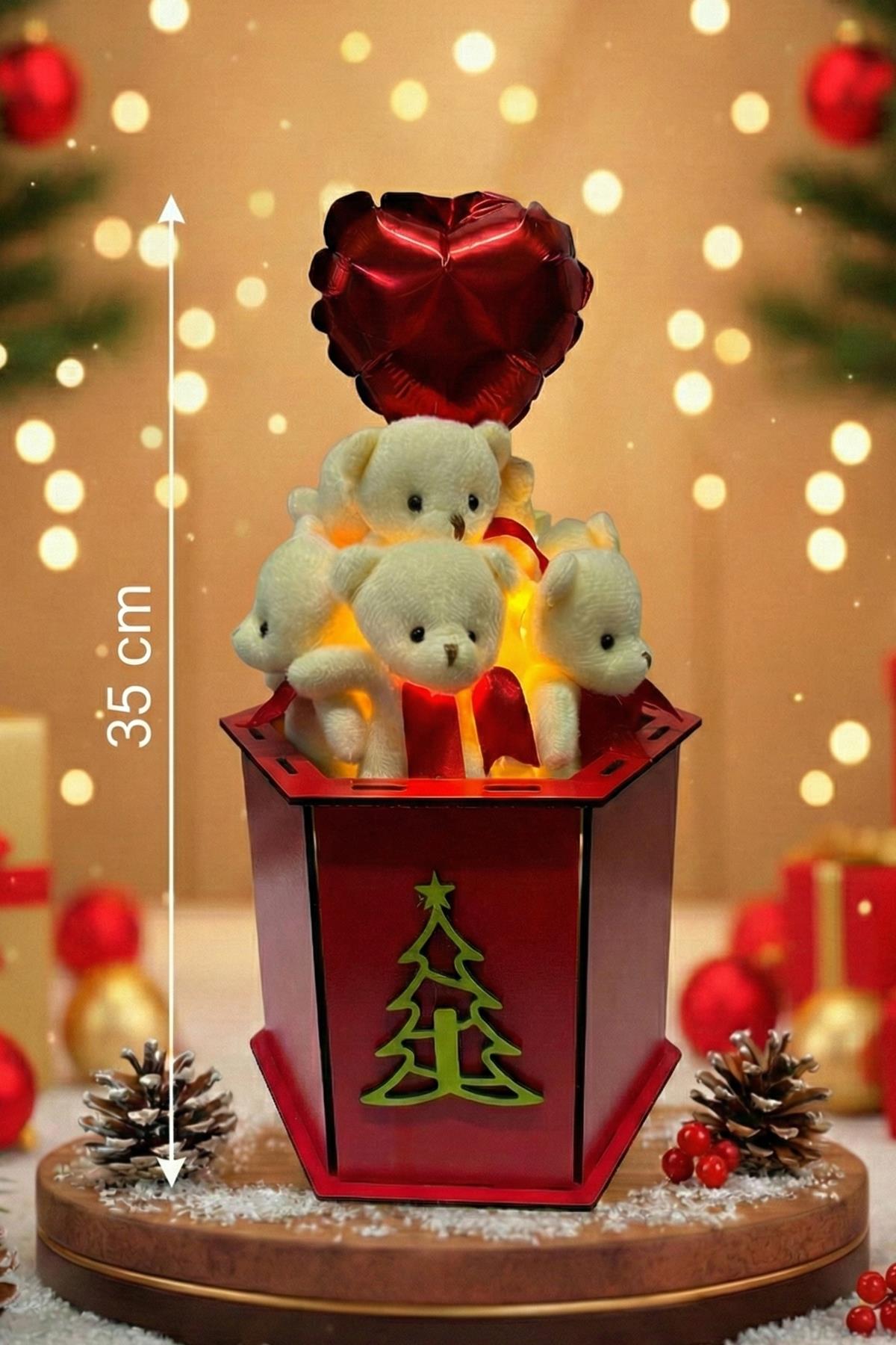 Kırmızı Özel tasarım ahşap kutusuna yerleştirilmiş ışıltılı LED’lerle aydınlanan mini peluş ayıcıklar, ortasında parlak kalpli balon ile tamamlanmıştır.