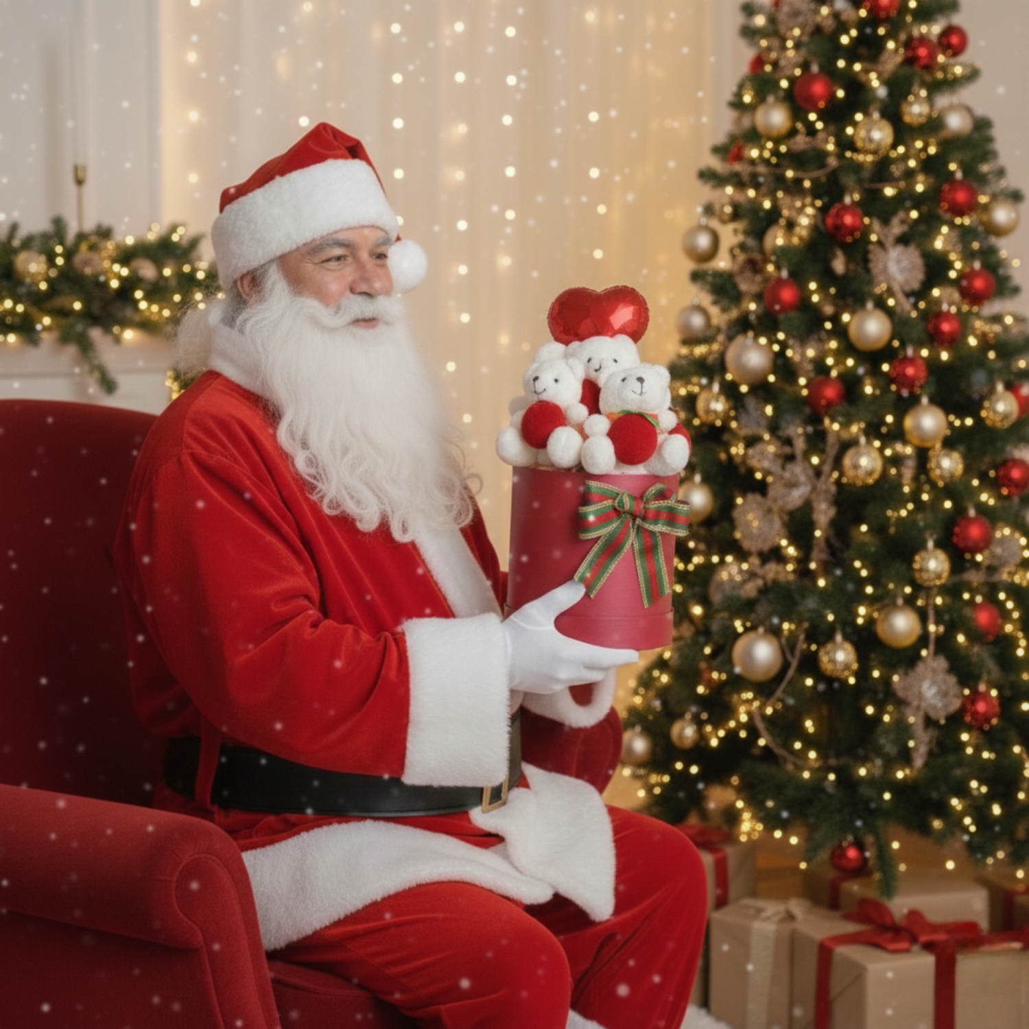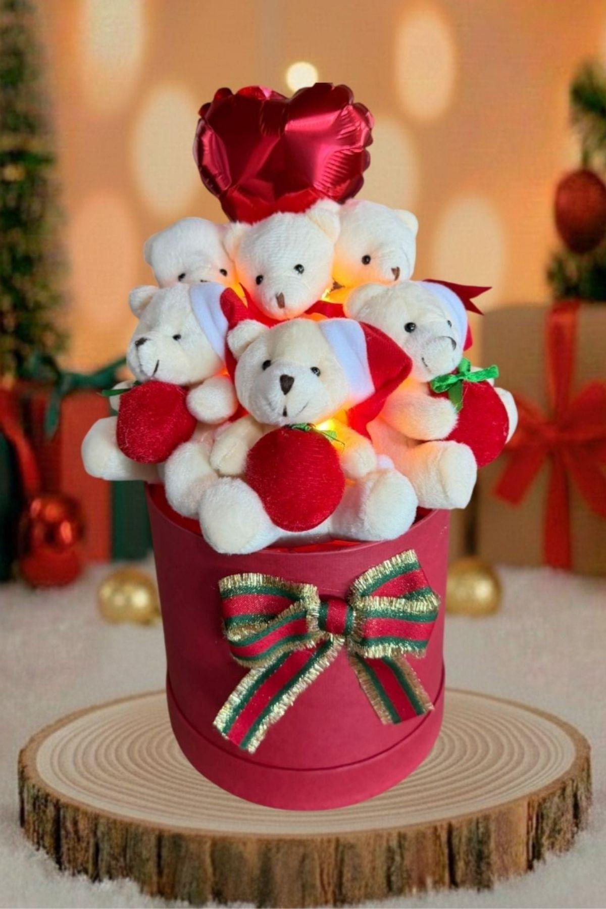 Kırmızı premium silindir kutu içerisinde; LED ışıklarla parlayan, Noel şapkalı ve elinde Noel çuvalı bulunan minik peluş ayıcıklar ile kalp formunda kırmızı folyo balonun bir araya geldiği bu özel tasarım; hem dekoratif hem de duygu dolu bir yılbaşı armağanıdır.